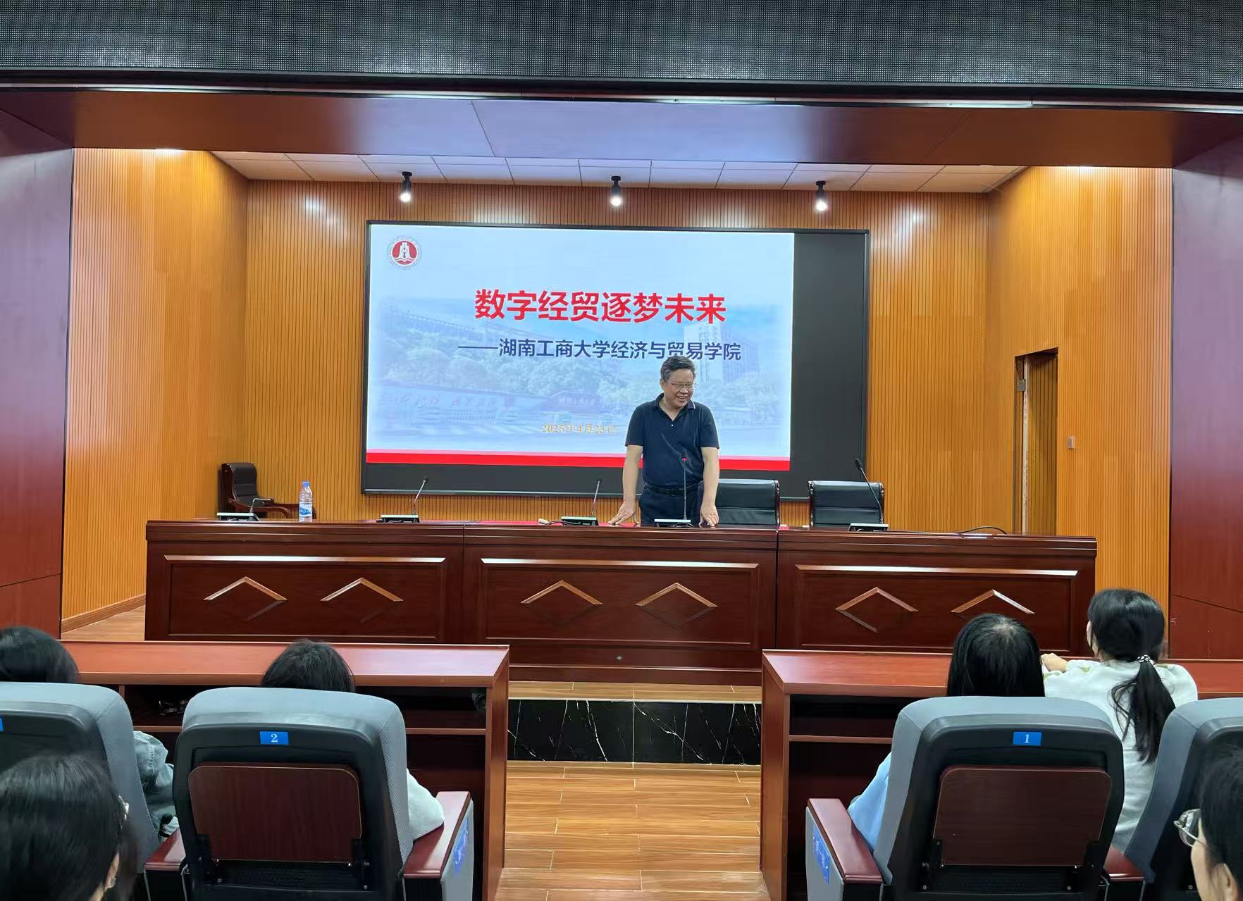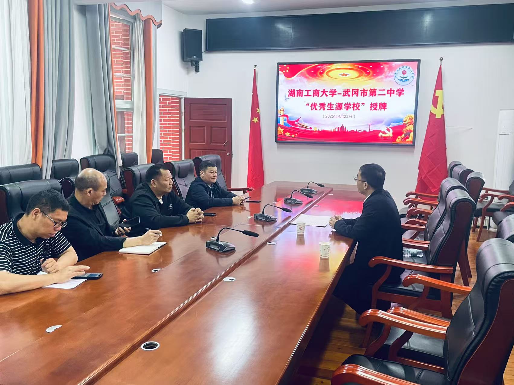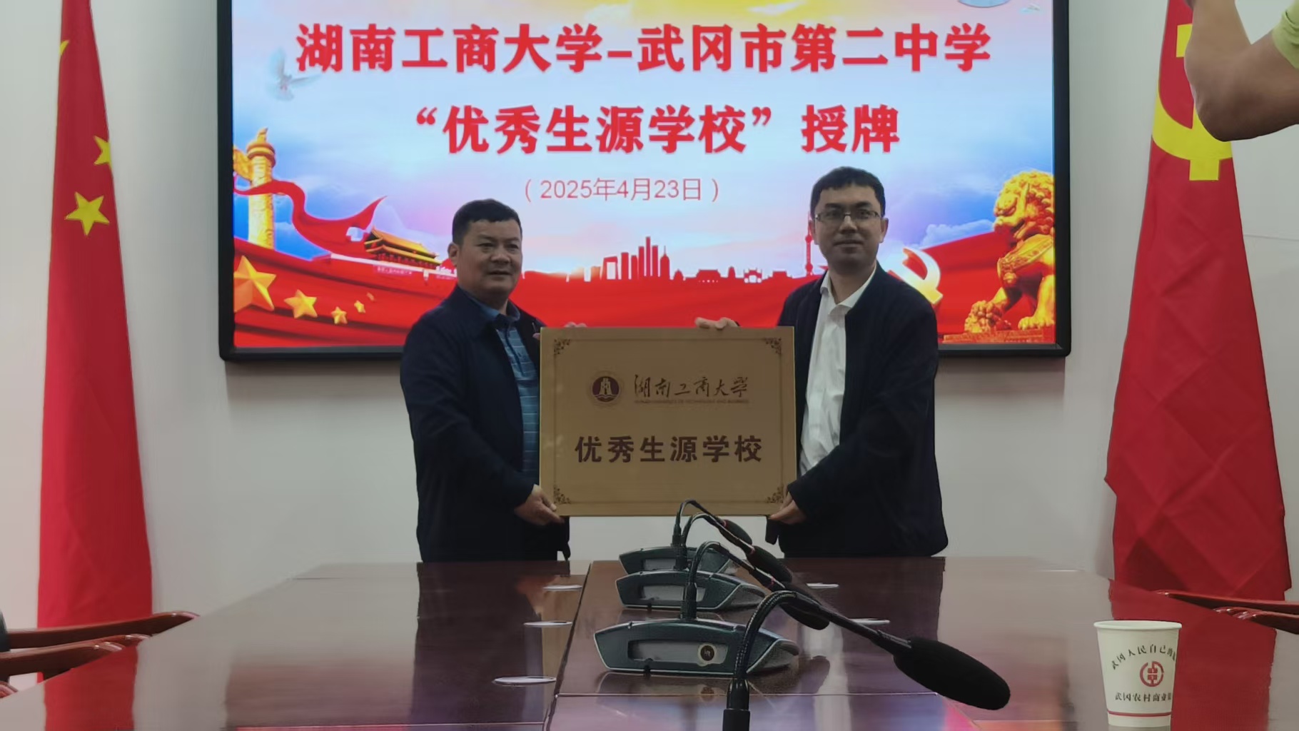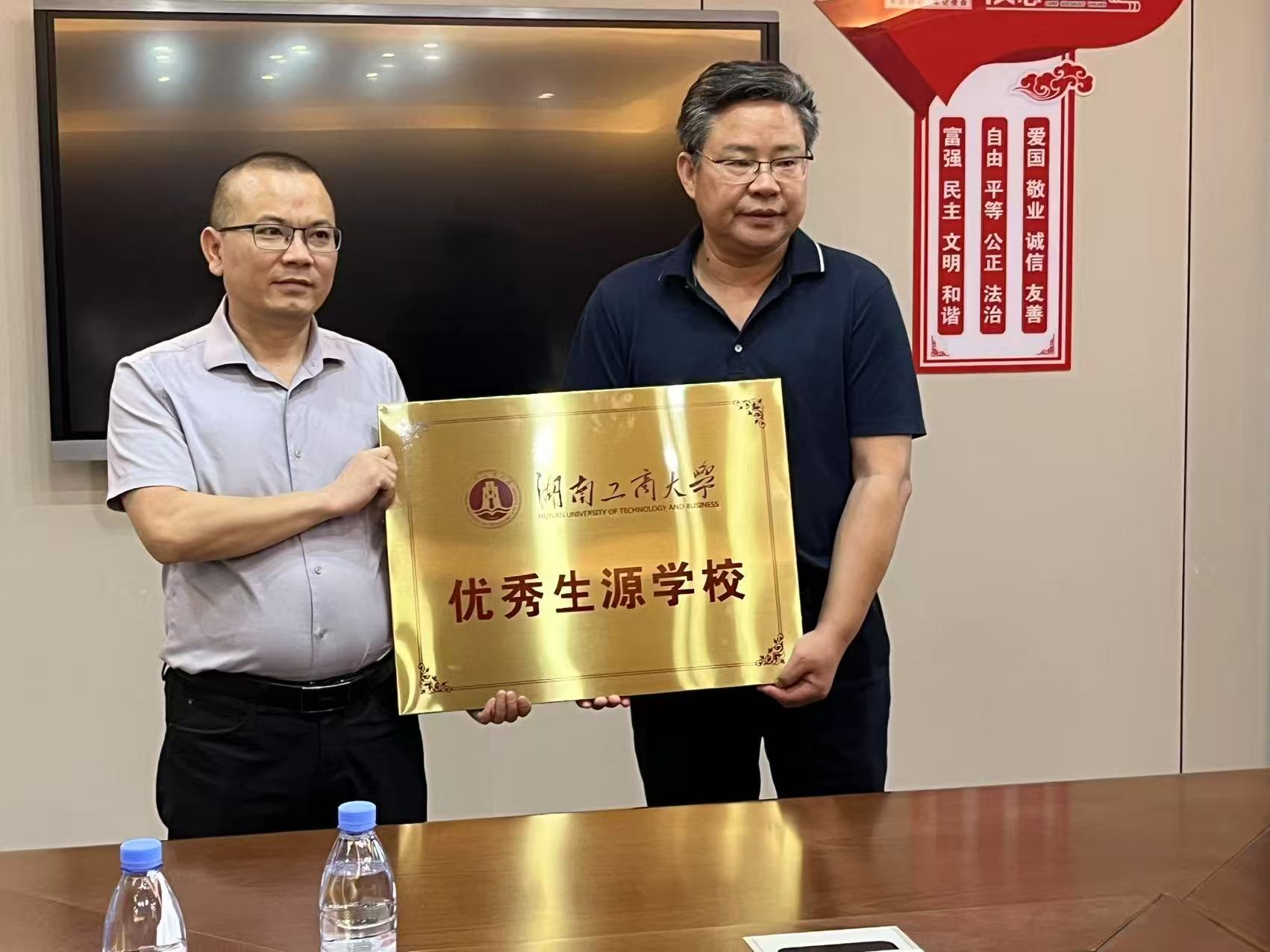 经济与贸易学院副院长侯向群副教授来到武冈市第二中学作招生宣讲。侯向群副教授与武冈市第二中学党总支书记、校长周孝军、办公室主任蒲宏健、教导处副主任何红继、教导处副主任左亮等就“优秀生源学校”共建开展了深入交流,双方签订了优秀生源合作协议书,并向武冈市第二中学授予湖南工商大学“优秀生源学校”牌。随后,高三年级组长马骅老师主持,侯向群副院长向武冈市第二中学的高三学生作了招生宣讲专题讲座。