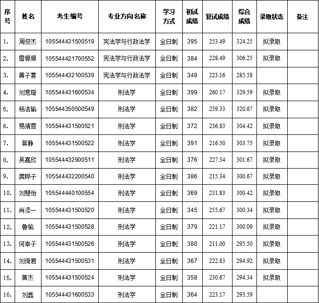 根据《湖南工商大学法学院2024年硕士研究生复试录取工作方案》,经研究生招生工作小组组织复试,现公示湖南工商大学法学院2024年硕士研究生一志愿复试结果,公示期为2024年4月1日—4月3日,公示期内如有异议,请向法学院研究生办公室反映。(联系电话:0731-88688300)