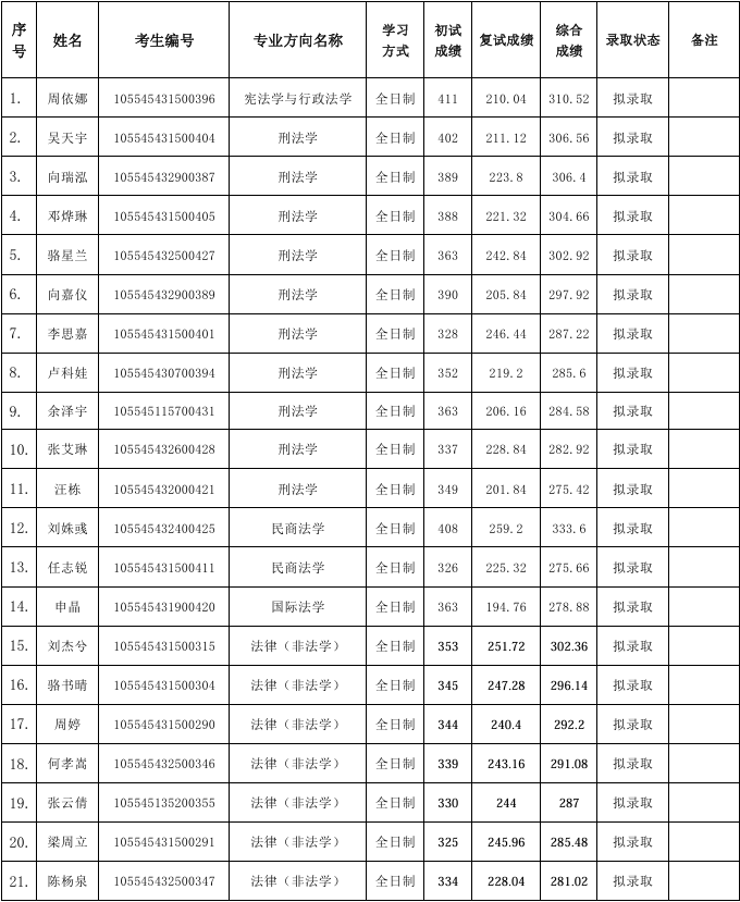 根据《湖南工商大学法学院2025年硕士研究生复试录取工作方案》,经研究生招生工作小组组织复试,现公示湖南工商大学法学院2025年硕士研究生一志愿复试结果,公示期为2025年4月3日—4月8日,公示期内如有异议,请向法学院研究生办公室反映。(联系电话:0731-88688310)